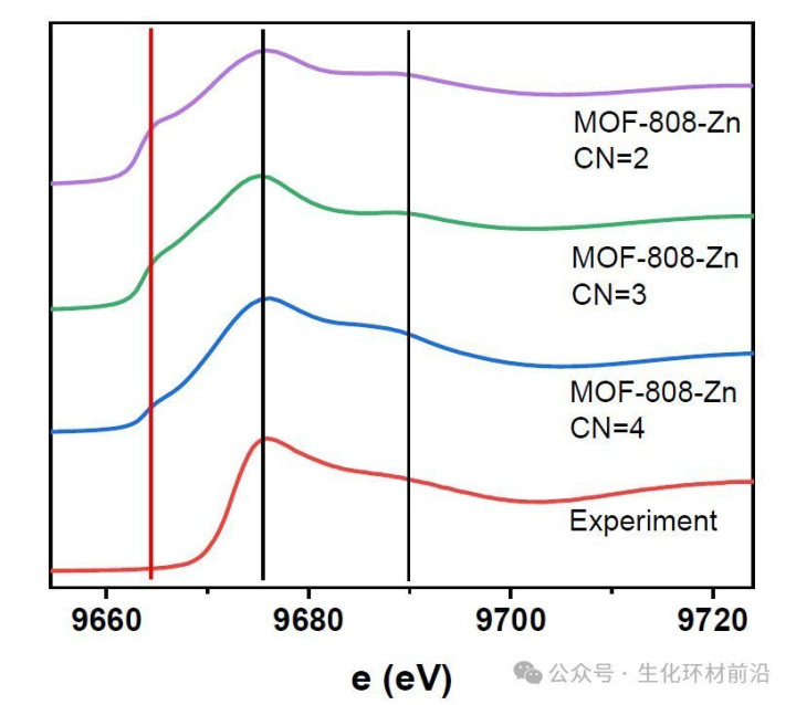 厦门大学汪骋课题组针对具有不同配位数(CN=2−4)的 MOF-808-Zn 开展了 X 射线吸收近边结构(XANES)模拟研究,结果表明,四配位四面体结构与实验光谱最为契合。