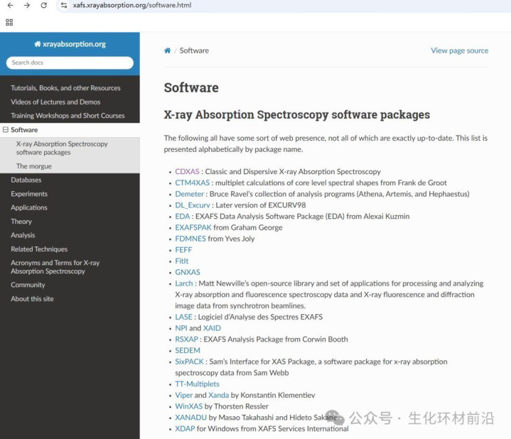 常用的X射线吸收光谱软件包有Demeter(Ifeffit)、FDMNES、FEFF、Larch。可以在X射线吸收谱官网上找到。