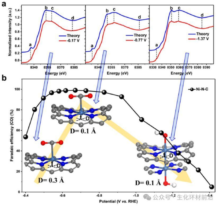 (a) Ni-N-C 在−0.17 V(左)、−0.77 V(中)和 −1.37 V(右)时的实验 Ni K-边XANES光谱与底部插图中示意性显示的相应部分的理论光谱的对比。(b) Ni-N-C的 CO 法拉第效率以及在代表性电位下对应的局部结构变化。