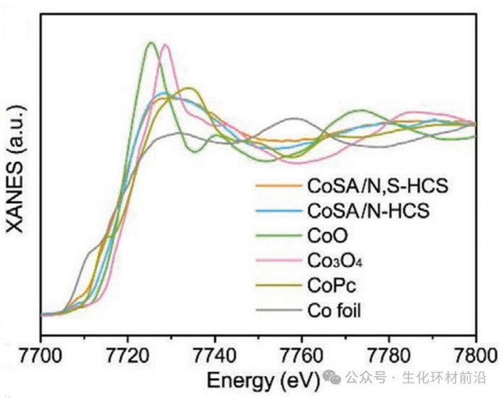 (Adv. Energy Mater. 2020, 2002896)Co SA/N,S-HCS、Co SA/N-HCS和参照样品在Co k边处的(b)XANES图谱